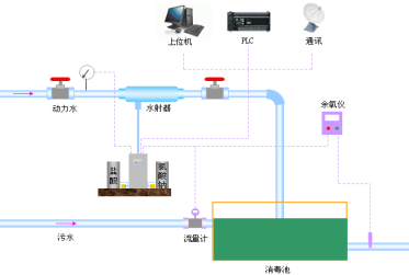 智能型二氧化氯发生器是由釜式反应器通过耐酸导管,水射式真空机组和电控柜组成。釜式反应器采用耐高温、耐腐、高寿命的改性四氟材料或钛合金材料,主反应釜内设有空气分布器,副反应釜设置了平衡管, 原料供应系统内的氯酸钠水溶液和盐酸(浓度30-31%)在计量调节系统、电控系统的作用下被定量输送到反应器内,在一定温度下经过负压曝气反应生成二氧化氯的气液混合物,经吸收系统吸收制成一定浓度的二氧化氯混合消毒液, 投加到待处理的水中或需要消毒的物体,完成二氧化氯的协同消毒、氧化等作用。